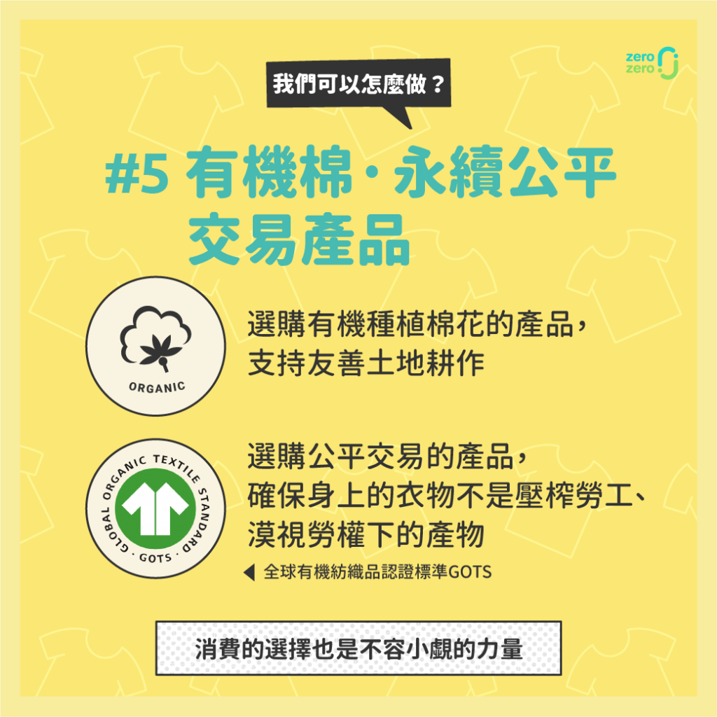 消費的選擇也是不容小覷的力量,選購有機種植棉花的產品,也意味著對友善土地耕作方式的支持。選購公平交易的產品,則能確保你身上的衣物,並不是壓榨勞工、漠視勞權下的產物。