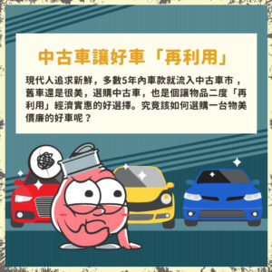 現代人追求新鮮,不少只開1~5年的車就流入中古車市,舊車還是很美,選購中古車,也是一個讓物品二度「再利用」、經濟實惠的好選項。究竟該如何選購一台物美價廉的好車呢?