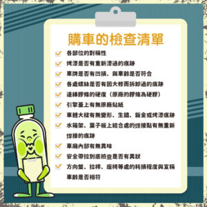 看車時最重要的就是判斷宣稱的「車齡」與「里程數」是否為真、是否為事故車或泡水車?可以藉由以下購車檢查清單細節判斷: