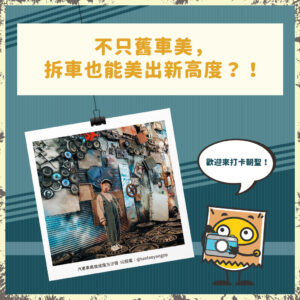 舊車除了轉賣二手車市、報廢回收再循環之外,還有一個令人耳目一新的創意之用。位於台南永康區的「zero zero拆車夢工廠」,是全台首座以「廢車拆解零組件」組成之場域,展現資源物回收再利用的無限可能。現場滿滿的復古風味,將老車重製成特殊造型的床組或是各種座椅沙發,以及各部位零組件經過工匠藝術,創作成令人震撼的裝置藝術,親臨現場更能感受到廢棄資源再生的強大震撼力。愛車一族不能錯過。