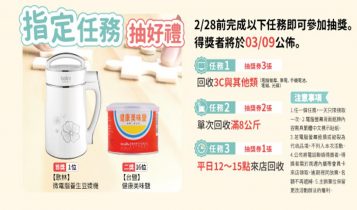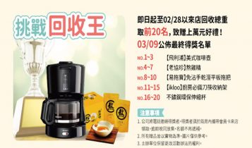 即日起至2/28來店回收累積量為前20名就有機會帶走萬元好禮!