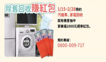1/15-2/28期間預約滿筆滿汽機車、家電回收