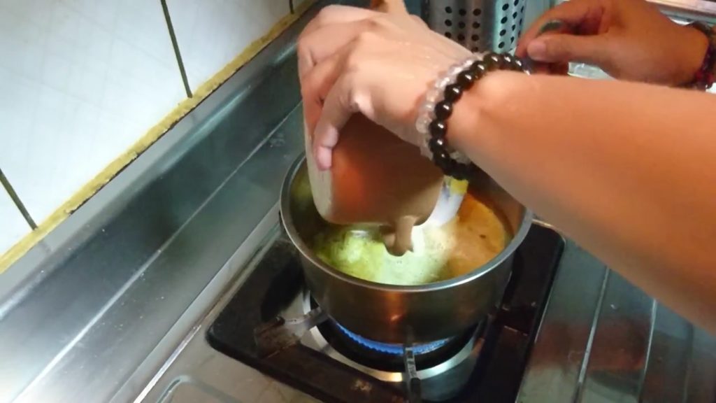 4.攪拌均勻且煮滾,最後加入椰奶,再稍微攪拌後即可食用。