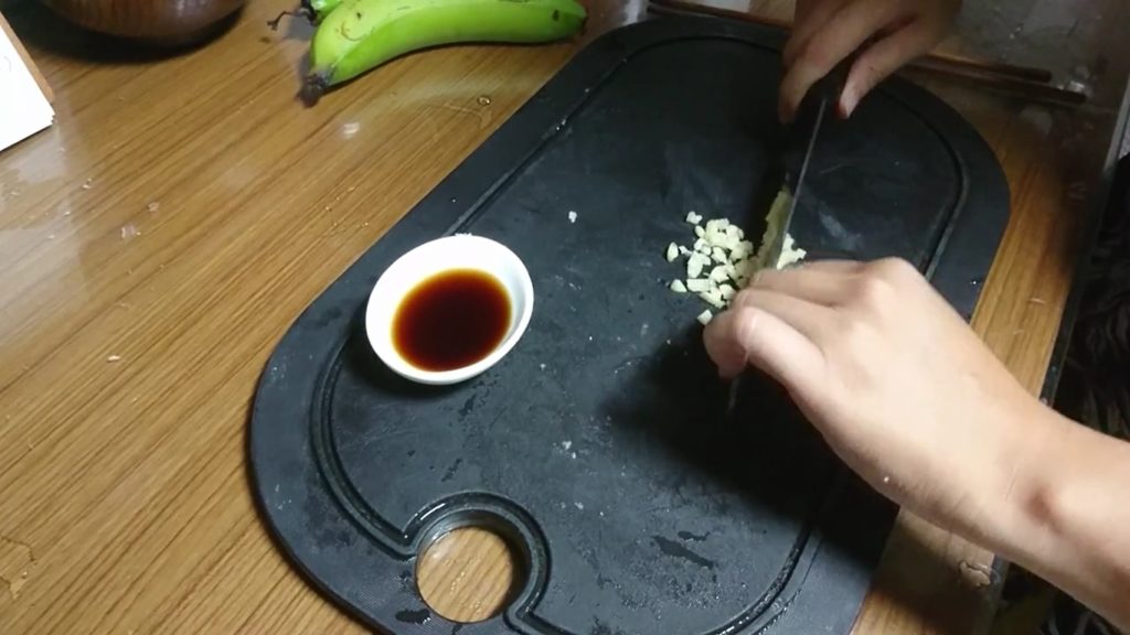 4.將蒜頭切碎後放進醬油,就可以蘸冰涼後的水煮青蕉來吃了。