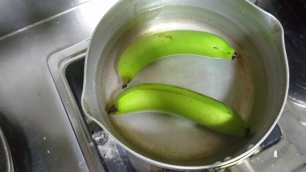 1.把生香蕉連皮一起水煮。
