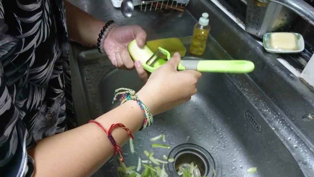 1.將生香蕉和洋蔥都去皮切末、切片。因為生香蕉皮不好剝,建議使用削絲瓜用的廚房刨刀刮除。
