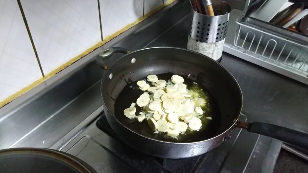 生香蕉2根、洋蔥1/2或1/4顆、薑末和蒜末少許、蔬菜高湯1碗(示範中用的是昆布高湯)