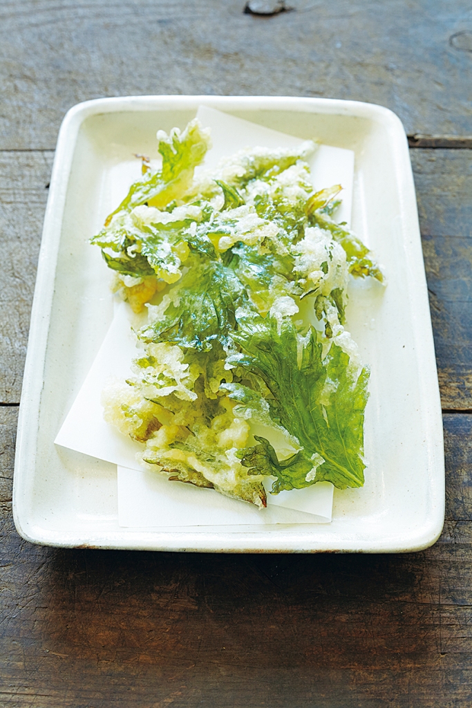 取1小把西洋芹葉,擦拭掉葉面上的水氣。以1:1的比例將天婦羅粉和水拌成糊狀。將麵糊沾滿西洋芹的葉子,接著放入中溫(約170度)的油炸鍋內,炸至麵糊酥脆即可起鍋食用。
