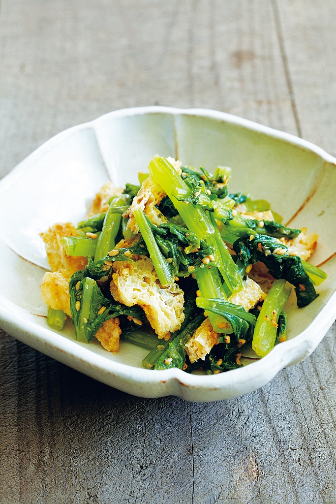 取2顆大頭菜的葉子部分,以鹽水汆燙後切成約3公分長。再取1/4片油豆腐火烤後切成薄片放涼;接著將大頭菜的菜葉和油豆腐放入碗中,加入2大匙醬油、1小匙砂糖、適量的熟白芝麻拌勻後即可食用。