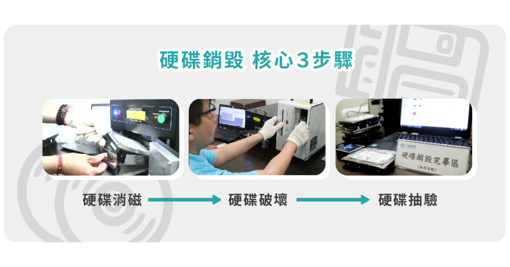 尋求硬碟銷毀服務的過程中,我們需要重視硬碟處理方式與銷毀流程的細節,以符合資訊安全法規與企業客戶內部的管理需求。嚴謹的銷毀流程,可分成三個階段: