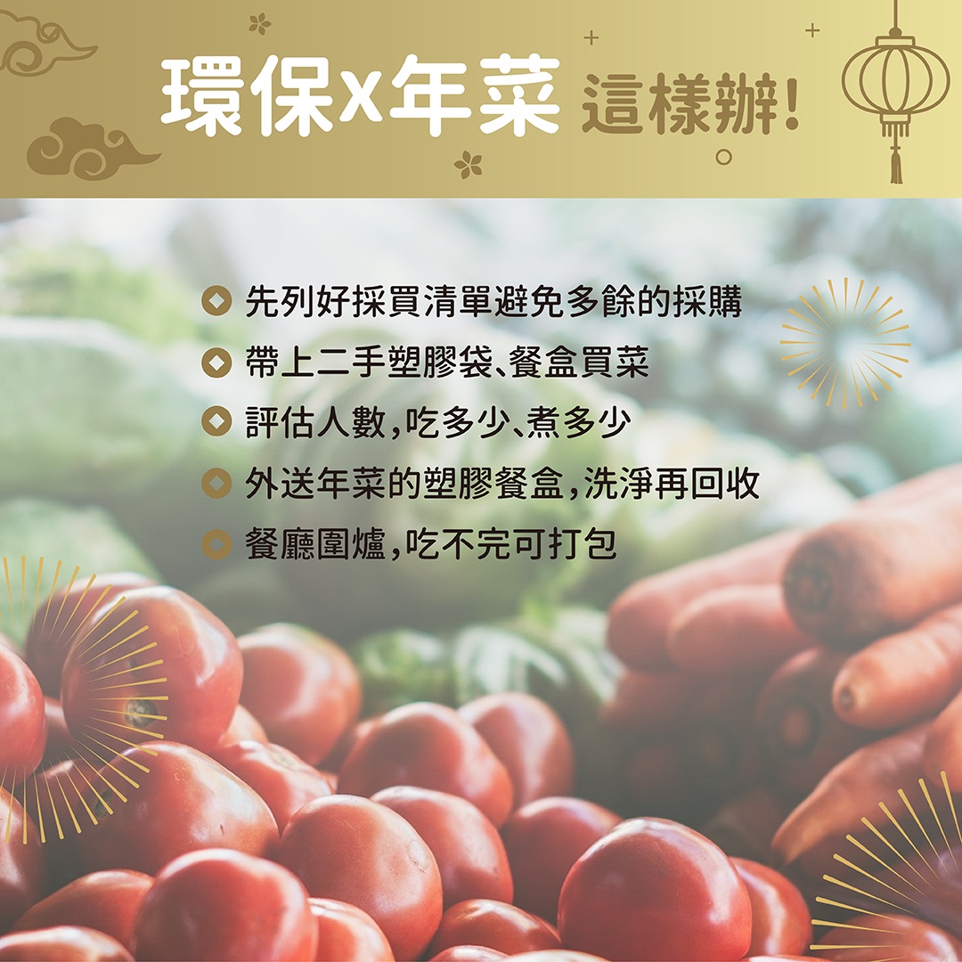 2021 年 2 月 1 日農曆新年即將到來,精明的主夫主婦已經開始張羅年貨了,包含團圓飯要煮幾道菜、拜拜要準備哪些供品,還有走春伴手禮要準備幾樣等等,除夕前都得好好打理一番。在添購年貨的同時,除了向親友與神明表示心意,如何不讓禮俗造成浪費或環境負擔,也是值得留意的課題!以下要介紹張羅年菜、祭拜供品及伴手禮時,可以加入哪些環保巧思,讓地球和我們一起過好年~