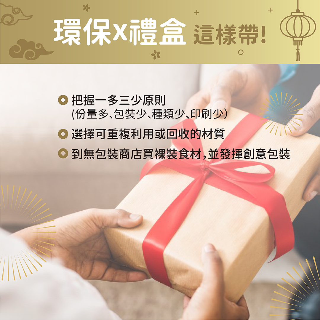 - 挑選禮盒時,把握一多三少(份量多、包裝材料少、種類少及印刷少)的原則。