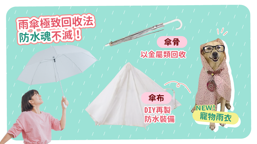 剛做完居家的防霉措施,出門遇雨怎麼能漏氣!選一把堅固好傘,抗戰十年都不是問題;如果雨傘不幸不敵強風、壽終正寢時,透過正確的回收與創意改造,也能讓雨傘材料重獲新生!回收雨傘時,剪開傘骨和傘布的縫線,可將兩者分離;傘骨能以金屬類回收,傘布則可以運用創意,DIY再製成寵物雨衣、書包遮雨布等防水裝備,徹底將舊雨傘運用到淋漓極致!