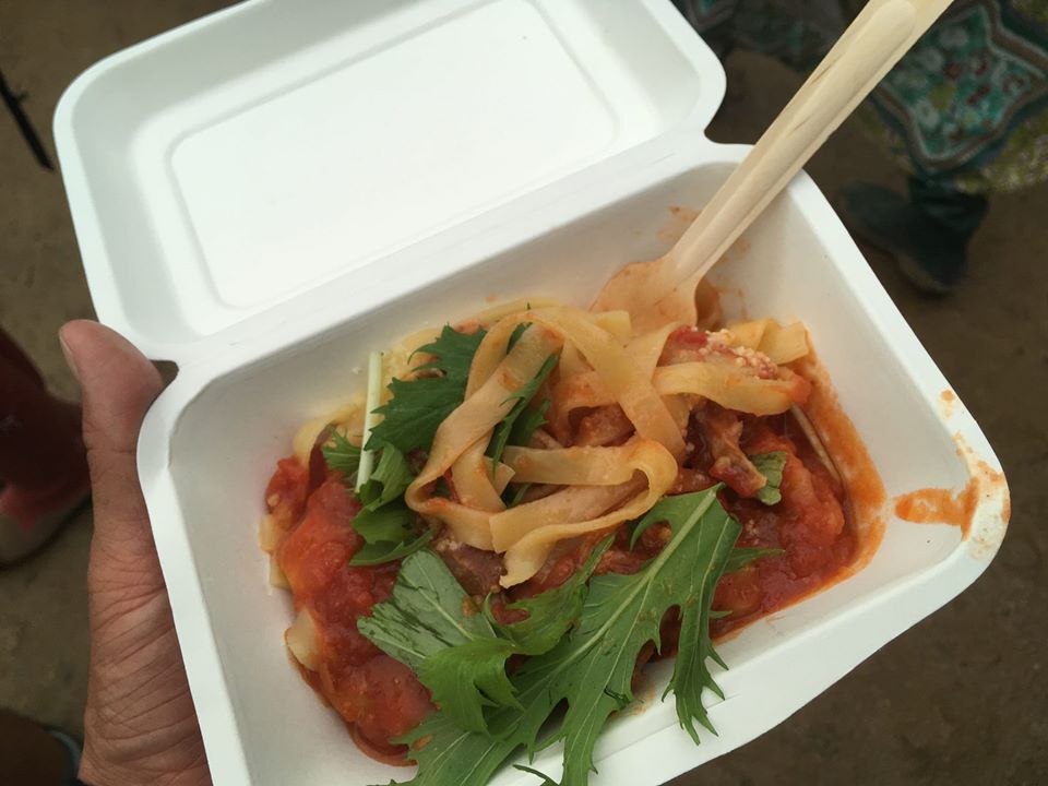 便當盒被我帶走,阿凱被迫使用紙便當盒,叉子是薄薄的木片。這是據傳是 Fuji Rock No. 1 Food 的太陽食堂。