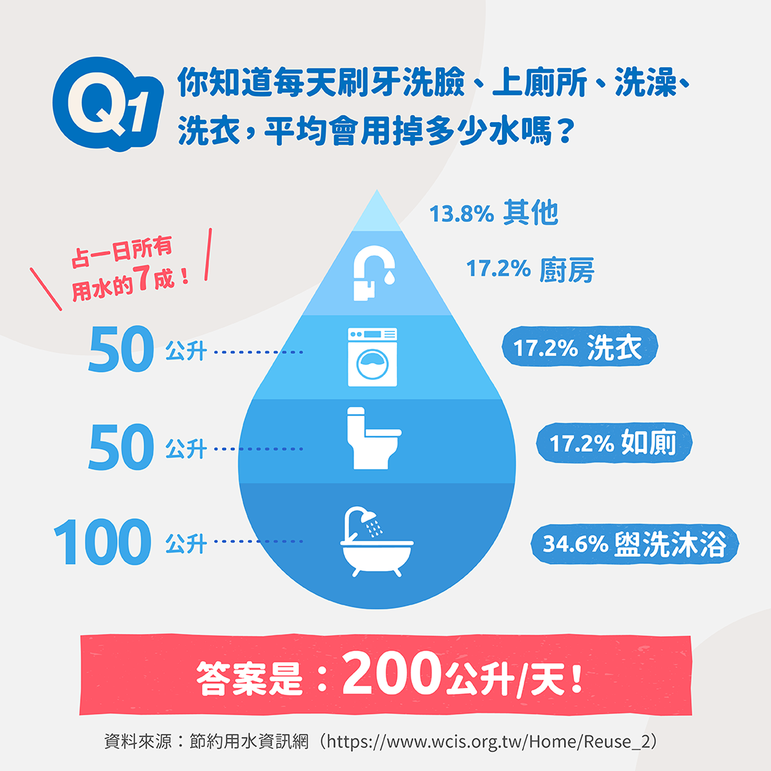 其中盥洗沐浴佔了 100 公升、如廁 50 公升、洗衣 50 公升,已將近用水的七成。如果能在這些用水時機,養成隨手好習慣,並留意水龍頭、蓮蓬頭、浴缸、馬桶、洗衣機等用水器具的效能,相信對家庭節水會有大大的幫助!