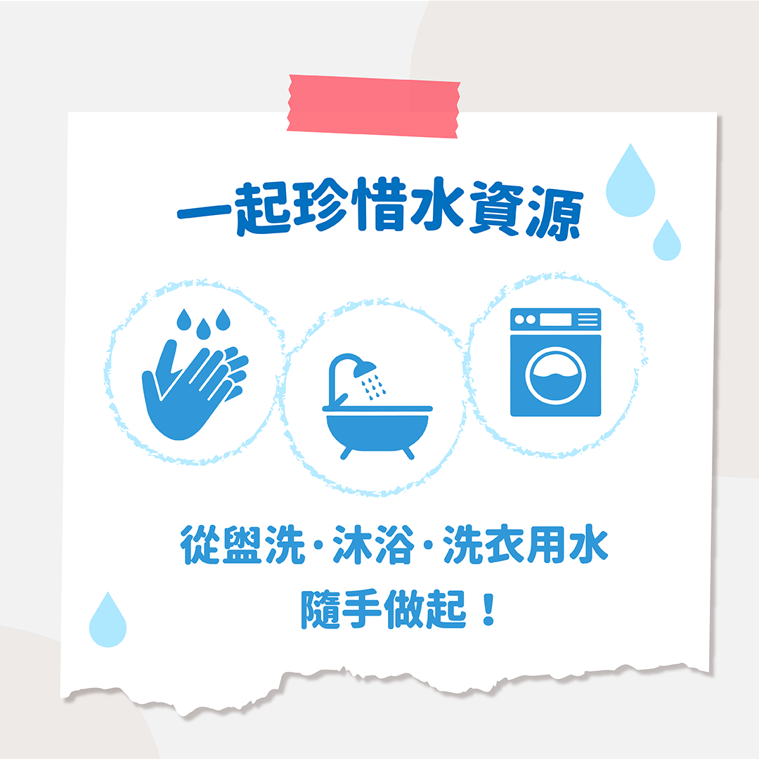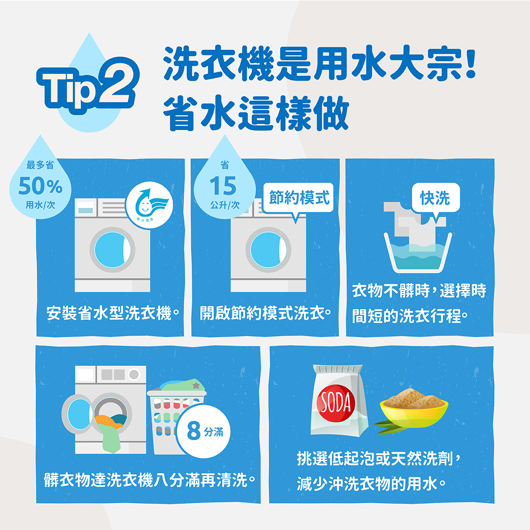 - 挑選低泡沫洗衣精、減少洗衣劑用量、改用天然洗劑如肥皂等,可減少沖洗衣物的用水。