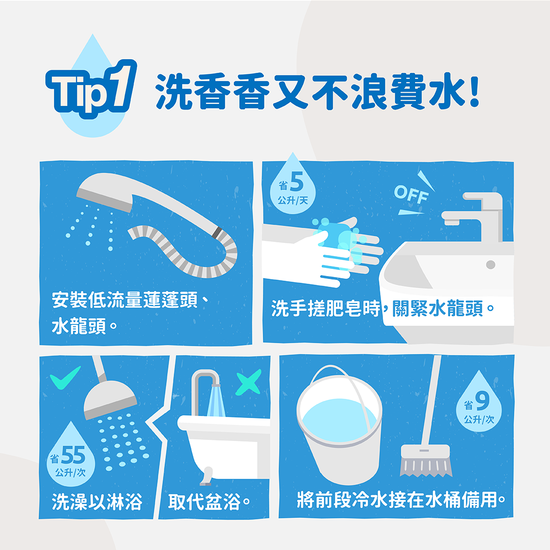 - 洗澡以淋浴取代盆浴,時間以不超過15分鐘為宜,平均一次可以省 55 公升的水。