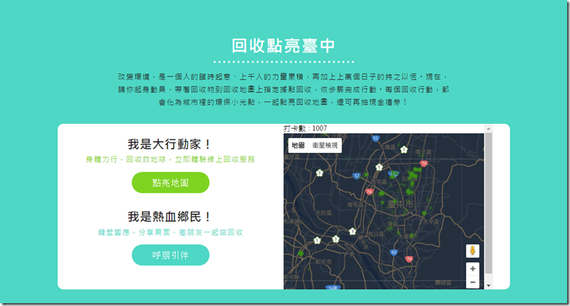 完成回收評價打卡,你的行動還會化成地圖上的亮點~一起點亮大台中!!