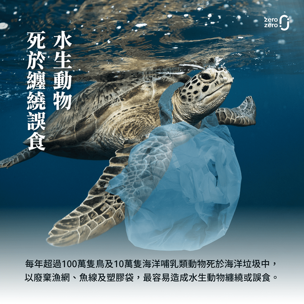 - 每年全球有超過100萬隻鳥及10萬隻海洋哺乳類動物死於海洋垃圾中,以廢棄漁網、魚線及塑膠袋,最容易造成水生動物纏繞或誤食。