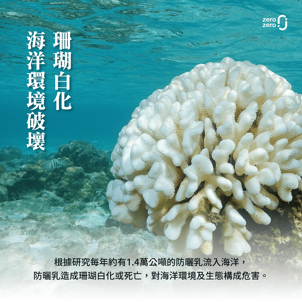 - 除了海水暖化,根據研究顯示,防曬乳中的部分成分也會造成珊瑚白化或死亡,對海洋環境及生態造成危害