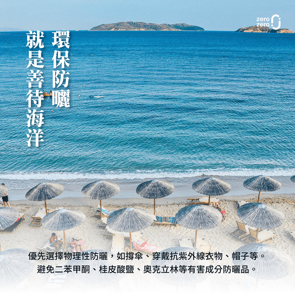 每年約有1.4萬噸的防曬乳流入海洋,嚴重影響海洋生態,進而加劇珊瑚死亡、白化速度。優先選擇物理防曬,例如:撐傘、穿戴帽子及薄長袖衣物等; 避免有害成分防曬乳,部分國家已明令禁止銷售含有害海洋成分的防曬乳,購買前確認成分,二苯甲酮(Oxybenzone)、桂皮酸鹽(Octinoxate)、奧克立林(Octocrylene)等防曬乳成分都盡量避免。