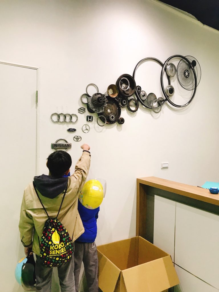 第二個最美拍照熱點就是櫃檯旁邊這個吸睛的藝術裝置,遠看是一些金屬圓框,而近看您會發現,這些都是從汽車拆解下來的零件!開幕當天吸引到許多小朋友駐足,爸爸媽媽除了趁這個機會帶小朋友認識汽車品牌的圖案,更可以用這個裝置了解到原來車子也可以回收再利用,從中了解到資源循環再生的意義!