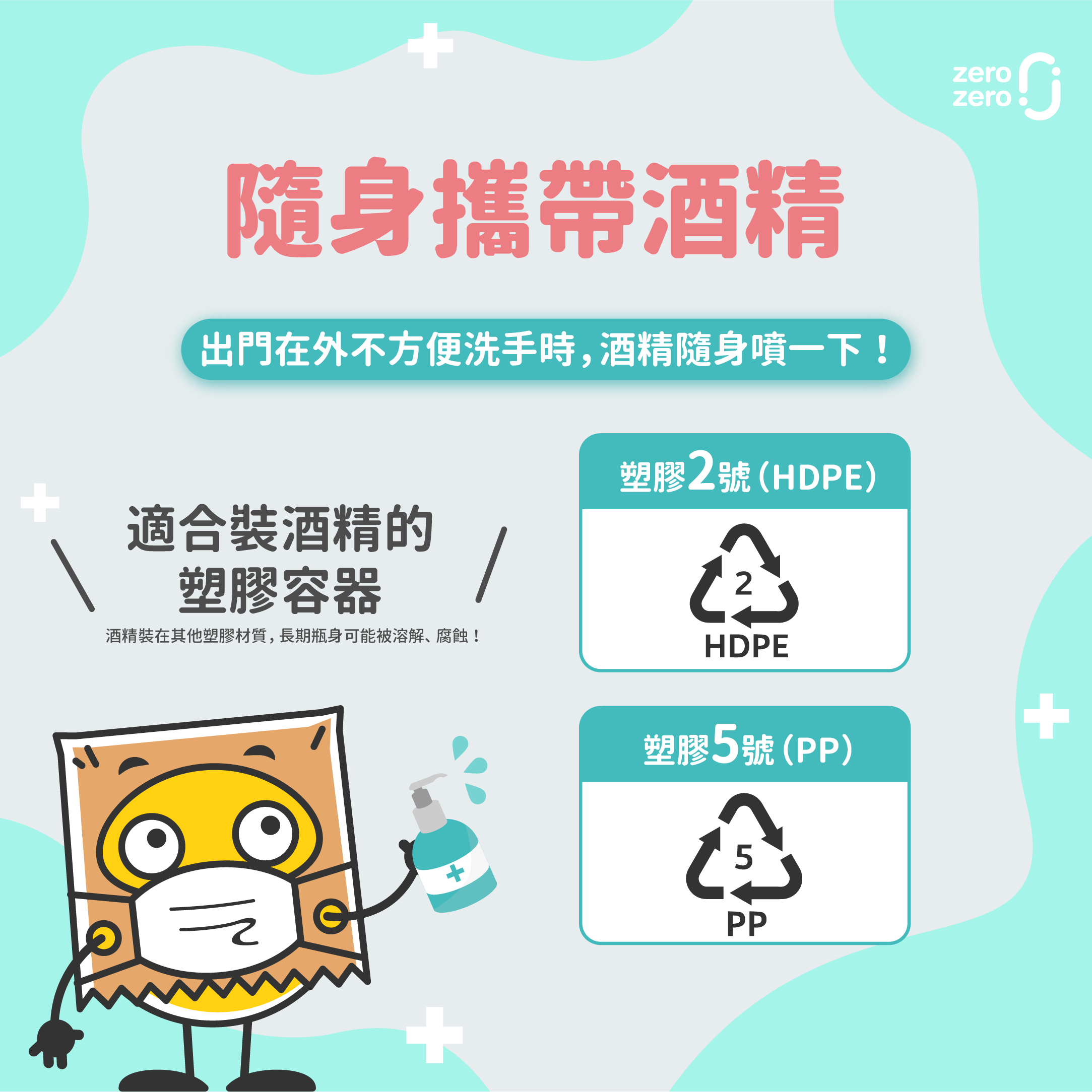 出門在外不方便洗手的時候,酒精就是重要的殺菌小幫手,隨身攜帶一罐酒精噴瓶,在拿完錢、或是觸碰公共區域的門把、按鈕後,可以消毒手部和物品。不過,找容器裝酒精時可要特別留意,由於酒精是強力的去油、殺菌劑,並不是任何材質都適合盛裝。一般而言,玻璃是最穩定的材質,如果要使用方便攜帶的塑膠罐,填裝前記得看一下塑膠容器瓶底的回收編號,選用塑膠2號(HDPE)、5號(PP)這類高密合度的塑膠材質,耐久度較佳,其他號碼的塑膠罐則不建議盛裝酒精,瓶身長期使用可能會被溶解、腐蝕。