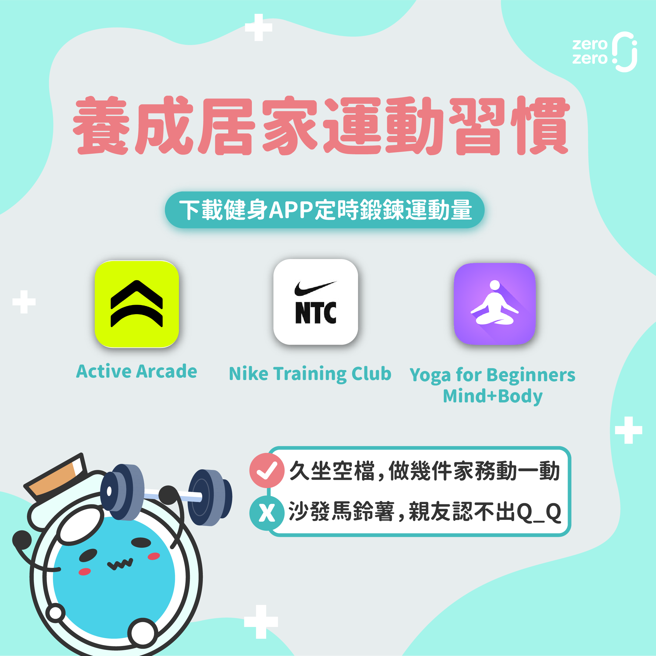 是時候擺脫沙發馬鈴薯的居家作息了!如果你對出門運動仍有疑慮,在家挪出固定的時間跳跳繩、做瑜珈,或是簡單的重量訓練、伸展操運動,都能維持一定程度的運動量,透過網路教學影片或 APP,也能輔助你把動作做得更好。或至少,每30分鐘起身走動、打掃也好,找機會進行日常的居家鍛鍊,絕對有助於你的健康。