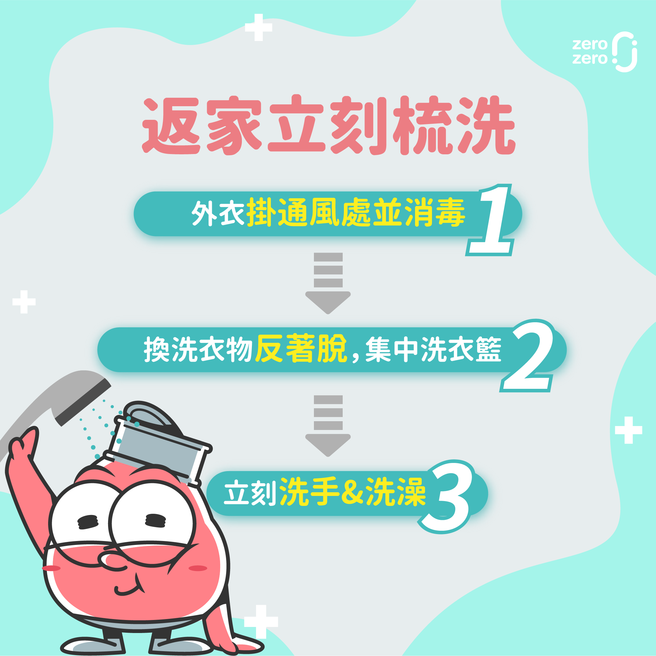 為了避免把在外接觸到的病菌帶回居家空間,養成習慣回到家就立刻更衣、洗澡,還沒要洗的外衣掛在通風處並適度消毒,準備清洗的衣物則反脫放置洗衣籃,避免病毒殘留在身上的任何機會。