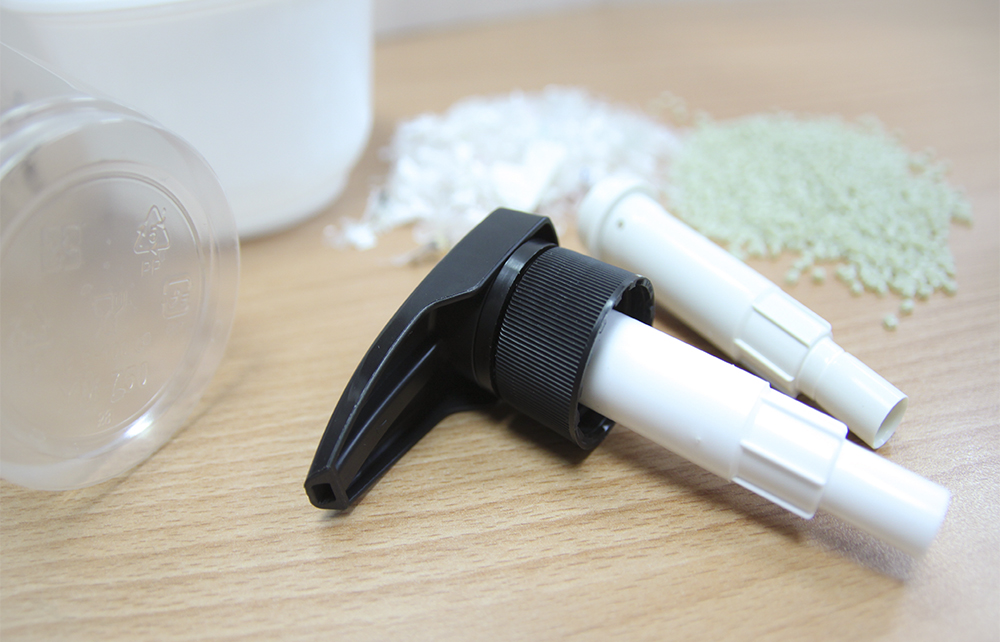 有了再生瓶身的成功經驗加持,欲使整體容器碳足跡再往下減少的歐萊德,將產品優化的目標鎖定到以往認為難度較高的押頭。相較於容器的瓶身,押頭的結構相對複雜,對於材料的要求條件也較高;在材料挑選上,大豐環保選擇塑膠材質標誌5號的聚丙烯(Polypropylene,簡稱PP),回收來源則為台灣民眾熟悉的手搖飲料杯,以及耐熱的食品容器。然而測試初期並未如預期地順利,經過多次的材料及製程上的調整修改,最終方達成預訂的高品質要求,協助歐萊德完成永續瓶器的最後一哩路,也同時實踐了搖籃到搖籃的精神。