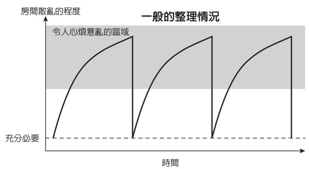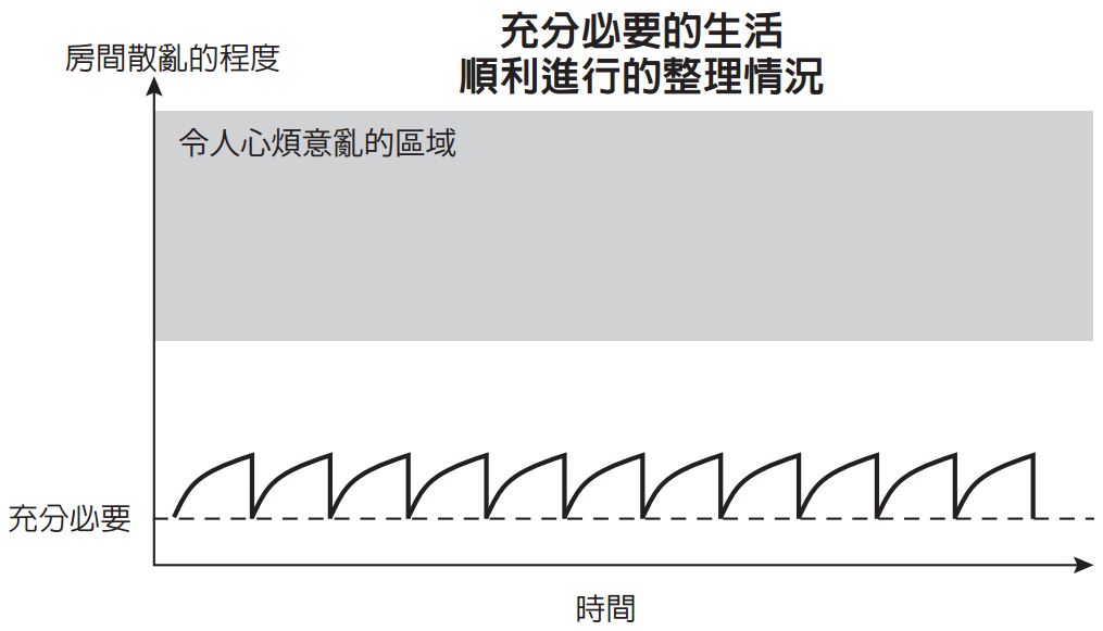 在充分必要的狀態下,整理就會變得很輕鬆。如果用圖表顯示的話,就像以下兩張圖一樣。上圖顯示一般的整理情況,下圖顯示充分必要的生活順利進行的整理情況。橫軸表示時間經過,縱軸表示房間的雜亂情形。進入灰色「令人心煩意亂的區域」之後,每次看到房間的樣子都會累積壓力。虛線表示充分必要的房間狀態。也就是物品不會過多也不會太少的狀態。