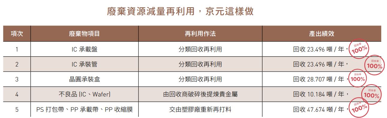 一般人可能很難想像,不從事製造的專業測試廠,也會有廢棄物產生?當京元 電子接下全球半導體市場製造後段流程的測試及封裝業務,在測試過程就會相 繼產生周邊 IC 配件等廢棄物。而在其中,主要有 13 項可回收廢棄物,來源包括測試中人員配備、包裝晶圓 IC 容器、外層產品保護容器,到測試後質量嚴選被淘汰的產品等。這些廢棄品項透過低污染、少廢棄物的綠色概念,打造回收再利用的循環再生能源,為廢棄物創造升級新生命,進而貫徹京元電子環境永續發展之理念,達到企業減廢至零廢的目標。